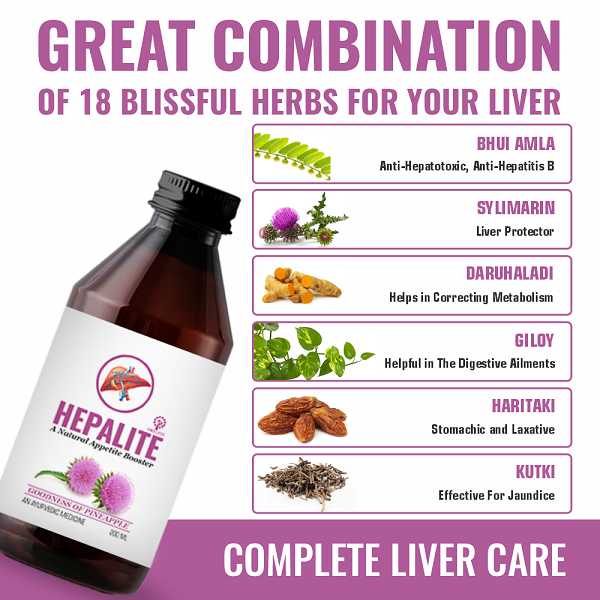 Hepalite is an ideal liver tonic that helps to detoxify liver and protect liver cells. It contains hepatoprotective herbs like Bhumyamalaki, Punarnava, Kasani and Kalmegh which are time-tested and well-documented to maintain liver health and improve digestion.