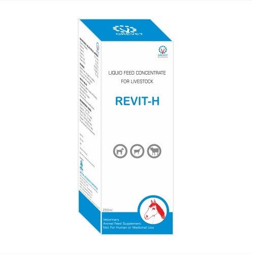 REVIT H is a specially formulated liquid feed supplement designed to meet the nutritional needs of cattle, cows, poultry, and other livestock. Enriched with Vitamin H (Biotin), Vitamin D3, and Vitamin E, REVIT H supports overall health, enhances productivity, and promotes optimal growth in farm animals.