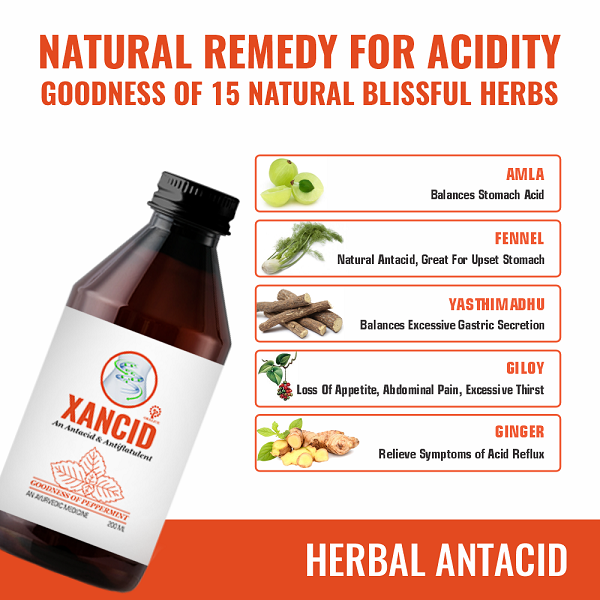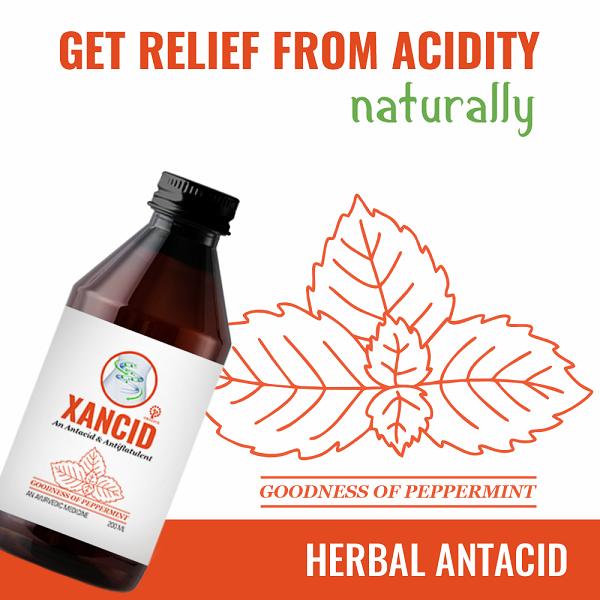 XANCID is an ayurvedic herbal formulation. It acts as an antacid. It relieves heartburn and acidity by neutralizing acid secretion. It also corrects other digestive disorders by promoting digestion. XANCID syrup keep up the optimum normal level of acid in stomach and prevent acid reflux in which gastric acid is regurgitated in food pipe causing acidic unpleasant feel in the mouth and upper nose.